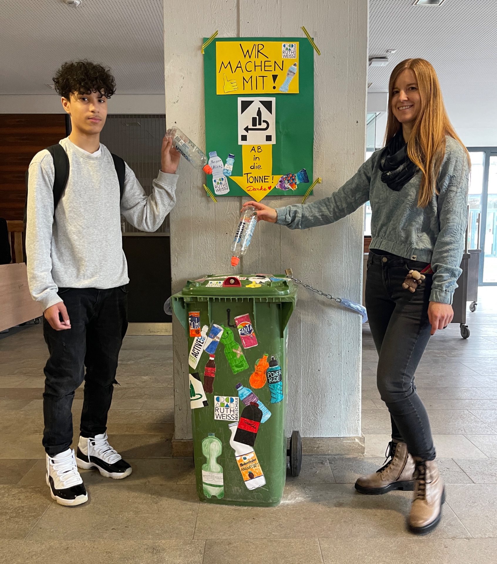 Ab in die Tonne … heißt es seit Juli 2023 an der Ruth-Weiss-Realschule Aschaffenburg. Seit über einem halben Jahr ist die Schulfamilie der Staatlichen Realschule dazu aufgerufen, Pfandflaschen in der neuen Pfandtonne zu entsorgen. Vorausgegangen war die Suche nach einem geeigneten Behältnis, um die Flaschen zu sammeln. Schnell erklärten sich die Stadtwerke Aschaffenburg bereit, eine grüne Tonne zur Verfügung zu stellen. Anschließend widmete sich Lehrkraft Alexandra Scheuber mit ihren Klassen im Kunst- und Werkunterricht der Gestaltung der Pfandtonne. Anfangs fanden nur wenige Pfandflaschen den Weg in die bunt beklebte Sammeltonne. Nachdem das Projekt zu Beginn des neuen Schuljahres über die Klassensprecher nochmals erklärt und beworben wurde, füllte sich die Pfandtonne zunehmend und musste im zwei- bis dreiwöchigen Abstand geleert werden. Anfang Dezember war bereits der schöne Betrag von 18,88€ Pfand zusammengekommen und über den Instagram-Kanal der Schule wurde abgestimmt, wohin das Geld gespendet werden soll. Mit großer Mehrheit wurde für das Aschaffenburger Tierheim abgestimmt und so konnte pünktlich zum Weihnachtsfest die Geldspende gemeinsam mit einer Vielzahl von Sachspenden aus einem separaten Spendenaufruf an das Tierheim übergeben werden. Auch im neuen Jahr wurden weiter fleißig Pfandflaschen an der Ruth-Weiss-Realschule gesammelt. Wohin die 20,13€ aus der aktuellen Sammelrunde gespendet werden sollen, steht aktuell zur Abstimmung.