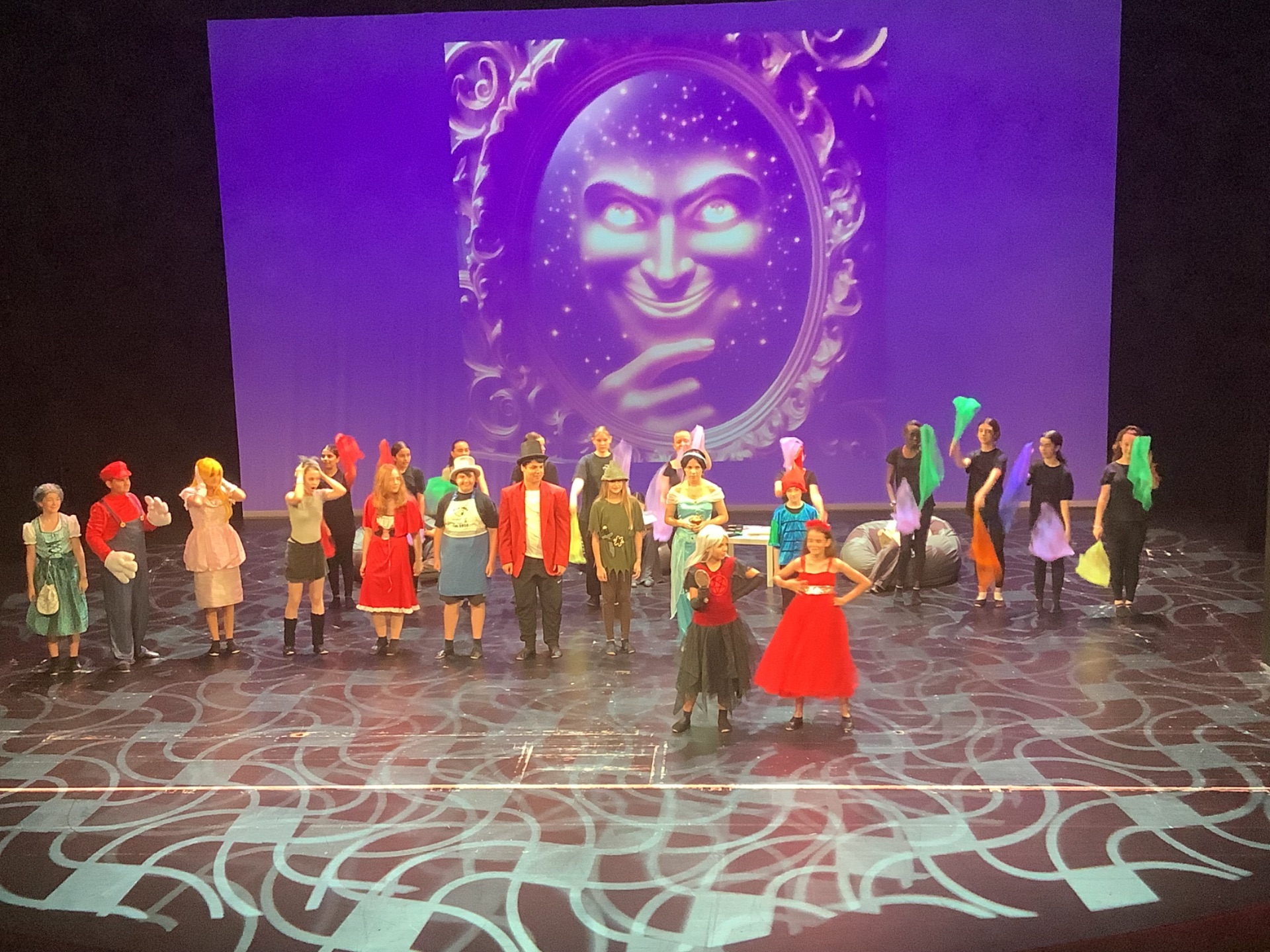 In diesem Stück versuchten Frau Holle, Super Mario und Peach, drei Jugendliche zu überzeugen, die immer schwächer werdenden Märchenfiguren vor dem Vergessen zu retten. Rumpelstilzchen, die Prinzessin auf der Erbse, Jasmin aus Tausend-und-einer Nacht, Peter Pan, der Besitzer von Tischlein- Deck-dich, die böse Königin, Rotkäppchen und der böse Wolf spielten ihre Verzweiflung so anschaulich, dass die drei Jugendlichen am Schluss doch noch zu den Märchenbüchern griffen und so das Überleben dieser Märchenfiguren sicherten. Der langanhaltende Applaus des begeisterten Publikums am Ende der Vorstellung zeigte, dass sich die vielen Proben während des Schuljahres gelohnt haben und dass die Aufführung ein voller Erfolg war.